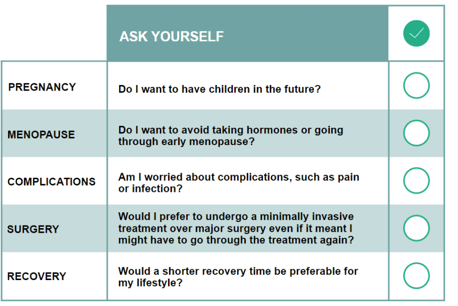 Some patients are unsure if UFE is the right procedure choice.  Consider the following questions to help determine if this might be the right procedure for your health goals. If you checked three or more boxes, then uterine fibroid embolization may be the right treatment option for you.